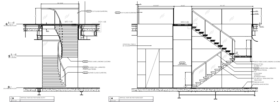Cantilever stair with glass guardrail ribbon that follows the edge of the treads from a gentle curve to a tight radius at the switchback.
