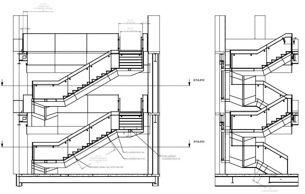 Feature stair for a Manhattan financial firm with stone treads, glass guardrail and blackened bronze cladding.